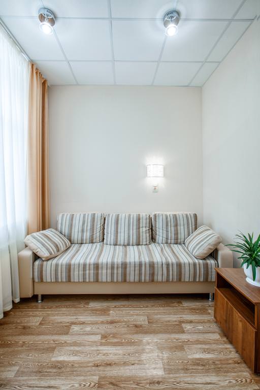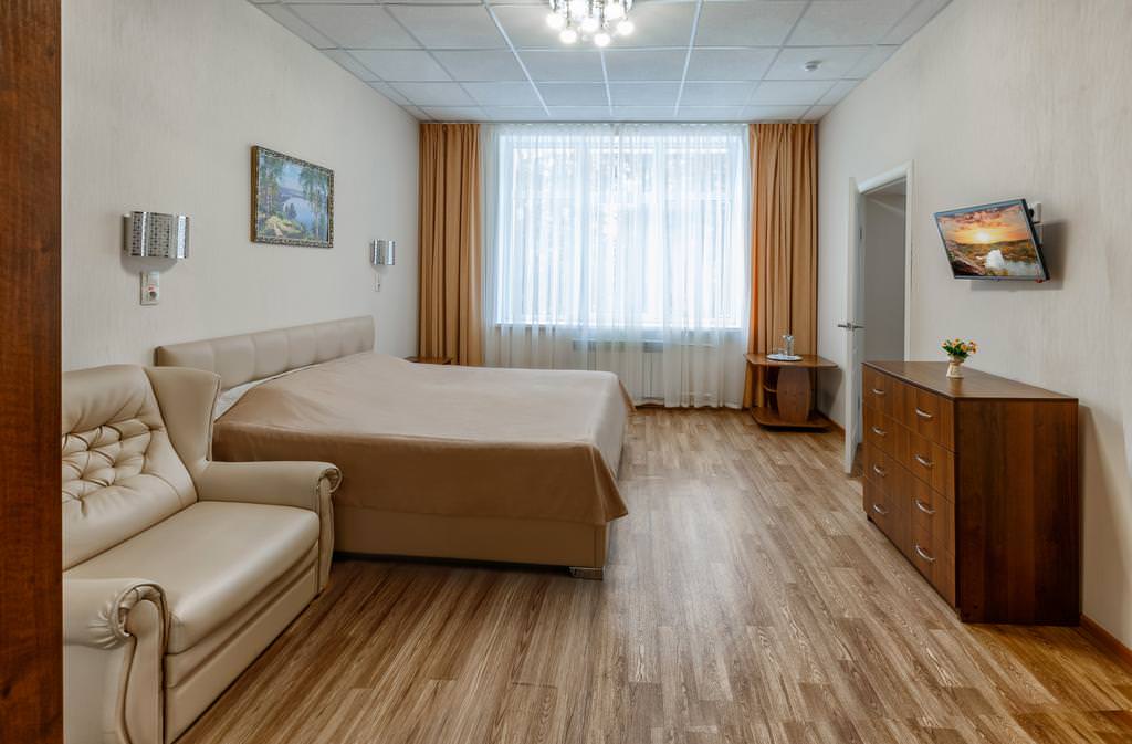 Площадь номера - 28-31 кв.м. 2 осн. места. 3 доп. места. Мебель: вешалка, гардеробная, диван раскладной, комод, кровать двуспальная/ две полутороспальные кровати, прикроватные тумбочки, стол, стул, шкаф. Оборудование. Санузел: с ванной, тапочки, туалетные принадлежности, фен, халат. Сервис: Wi-Fi бесплатно, смена полотенец, смена постельного белья, уборка номера.