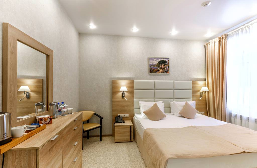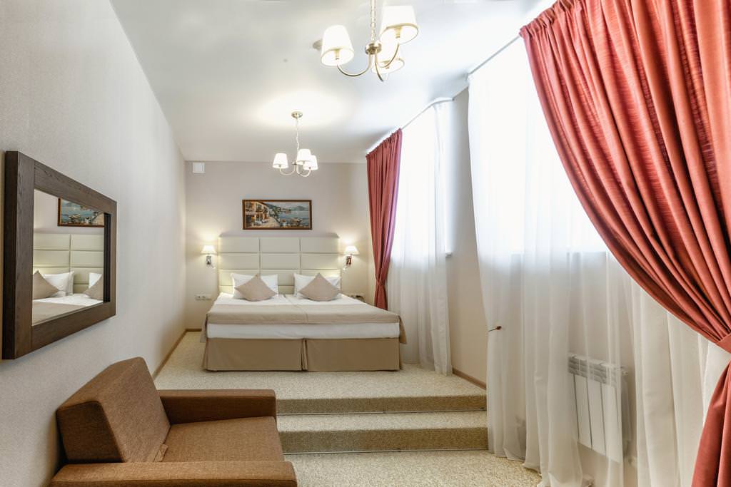 Площадь номера - 24 кв.м. 2 осн. места. 1 доп. место. Мебель: вешалка, гардеробная, комод, кресло-кровать, кровать двуспальная, прикроватные тумбочки, стул. Оборудование: гладильная доска, сейф, телевизор, телефон, утюг, чайный набор посуды, электрочайник. Санузел: с ванной, тапочки, туалетные принадлежности, фен, халат. Сервис: Wi-Fi бесплатно, смена полотенец, смена постельного белья, уборка номера.